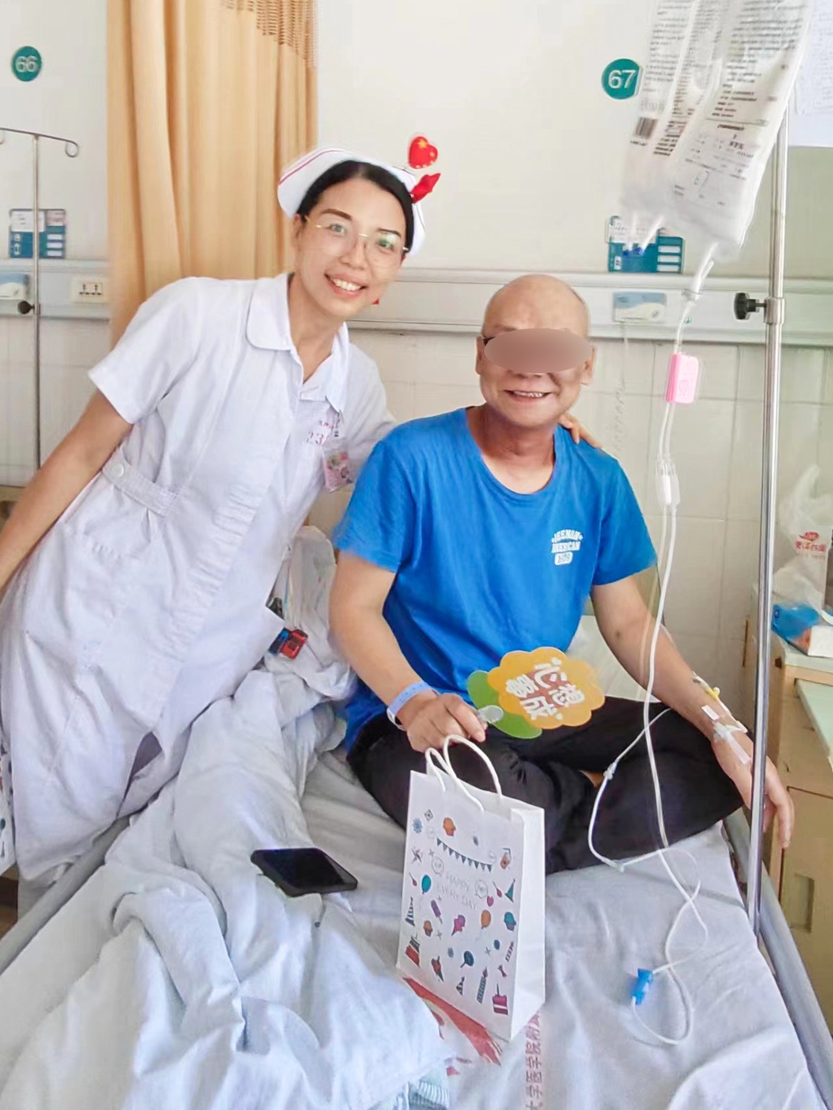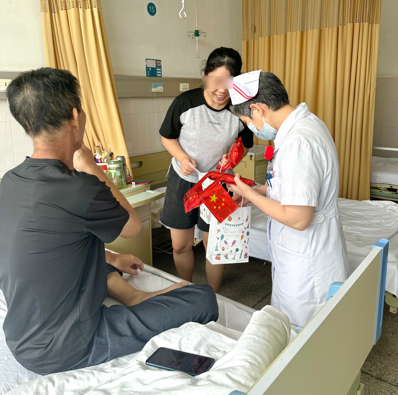 丹桂飘香送祝福,浓浓关怀暖人心,医务人员为患者送上的是手工作品,给予的是健康,传递的是祝福,缓解了患者思念家人的低落情绪,鼓励他们用积极的态度面对治疗,并引导他们在困惑时期互相激励,携手共渡难关。 双节送祝福,体现了 医护人员始终秉承以患者为中心的理念,打造有温度的医疗与护理环境,让患者在得到妥善治疗的同时,也感受到病区工作人员的精心呵护,感受到家的温暖,树立战胜疾病的信心,谱写医患同心战病魔的赞歌。 (放疗一区) |