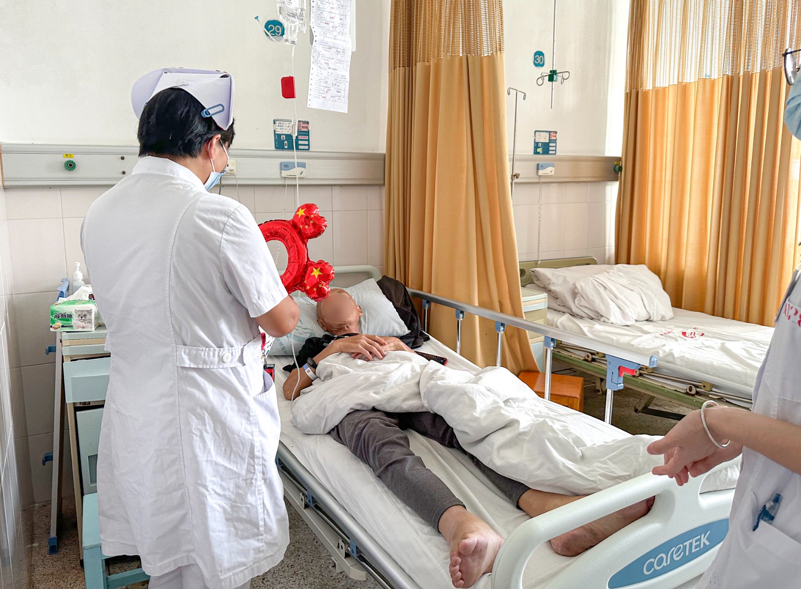 放疗一区的医务工作者还深入到临床病房,为一些行动不便的患者送上祝福,每到一间病房,暖小护们都会送上节日的祝福,详细询问患者的治疗、康复情况,鼓励他们安心养病,积极配合治疗,争取早日康复,与家人团聚。