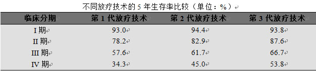 ![]() 注:表中数据为治愈率(5年生存率); 第1代放疗技术:1989年至1995年,60Co治疗,规则野照射,耳前野+前颈切线野; 第2代放疗技术:1996年至2001年,直线加速器或60Co治疗,传统二维模拟机模拟定位,面颈联合野+面颈分野配合电子线野照射 第3代放疗技术:2002年至2007年,病人三维CT模拟定位,治疗计划系统(TPS)设计放疗计划,即三维适形放疗计划(3D-CRT)
