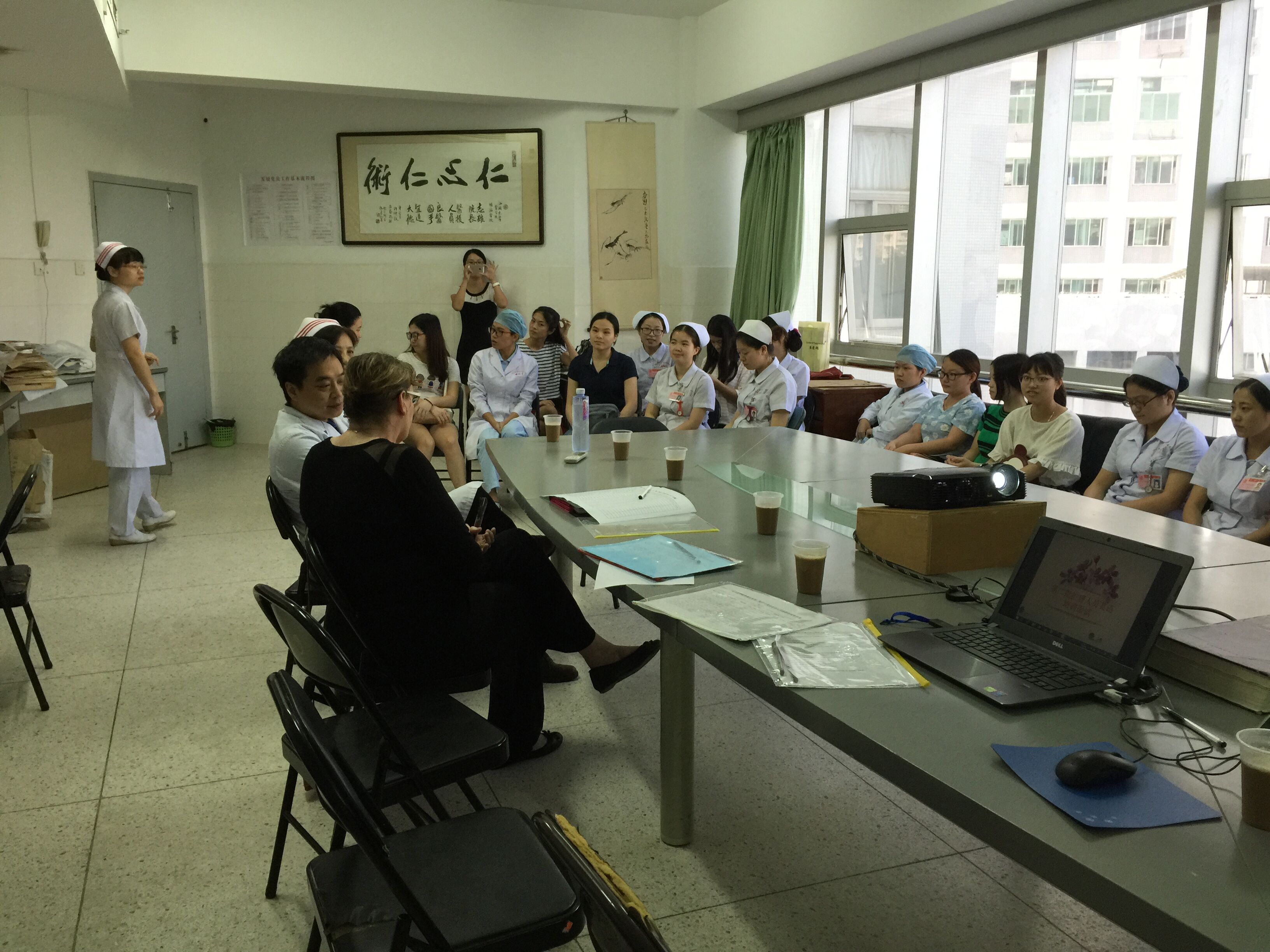 在去年Clinical Nursing Procedures 理论学习的基础上,这两个学期,我们逐渐过渡到临床技能、临床实践当中。我们带Mary老师参观医院的各个科室:呼吸肿瘤内科、淋巴瘤及血液肿瘤内科、消化肿瘤内科、腹部外科、头颈外科、放疗科等等。我们向老师介绍科室的专科特色及分享护理个案,包括各项临床技能操作,如造口护理、PICC的维护、气管套管的护理等等。老师不仅表扬我们细心、规范,还鼓励我们将各个护理操作拍摄成视频,作为规范,供新护士、护生学习。同时,老师也跟我们分享了国外一些先进的技术及理念,给我们提出一些中肯的建议。