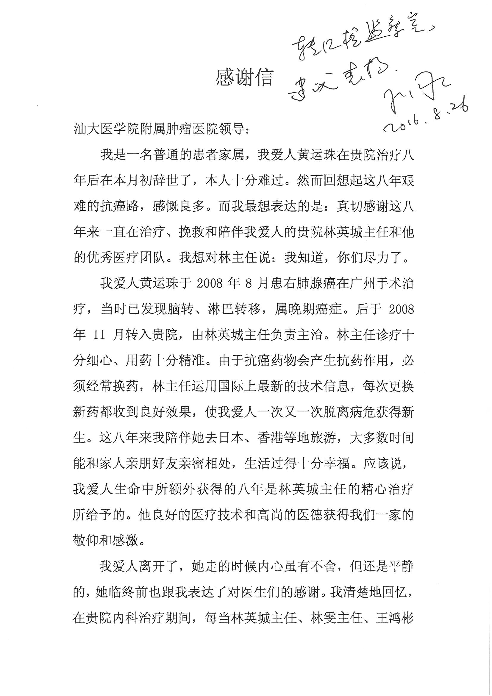 来自呼吸肿瘤内科的表扬信(2016-8-26院长室转交纪检监察室)