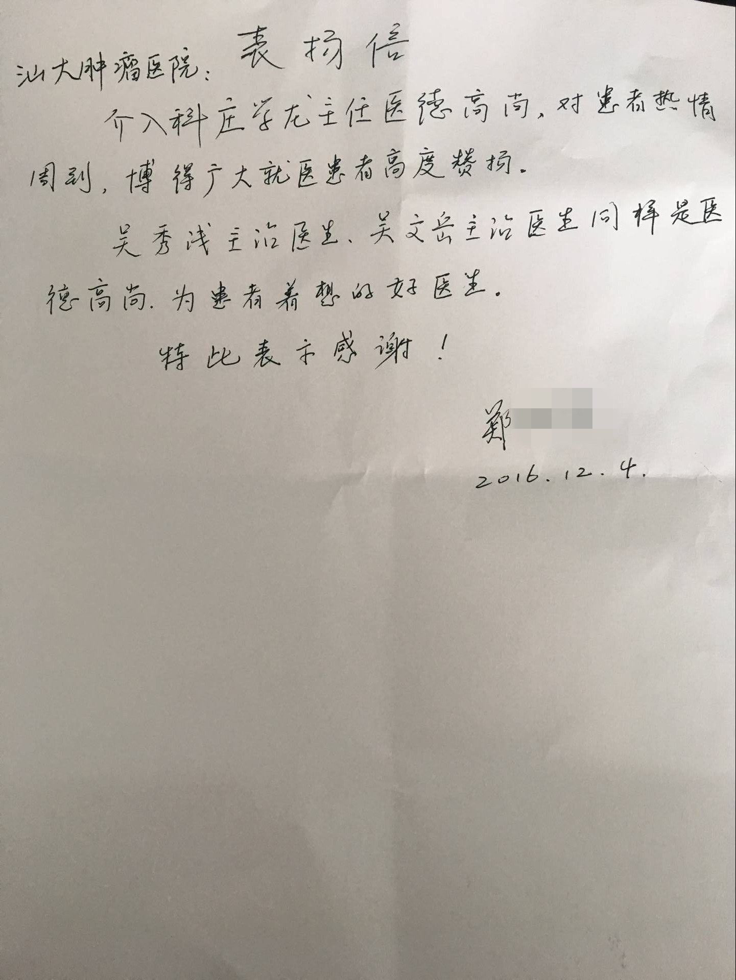 来自介入科的感谢信(2016-12-4纪检收到)